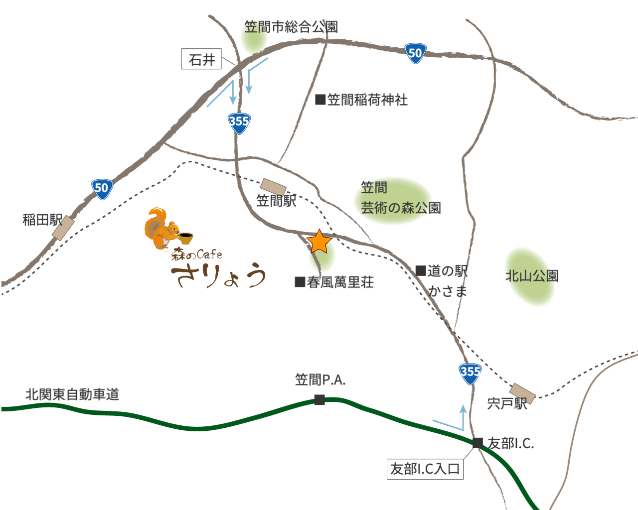 友部I.Cから国道355号線に入り、「笠間駅」方面へ向かって4.5km